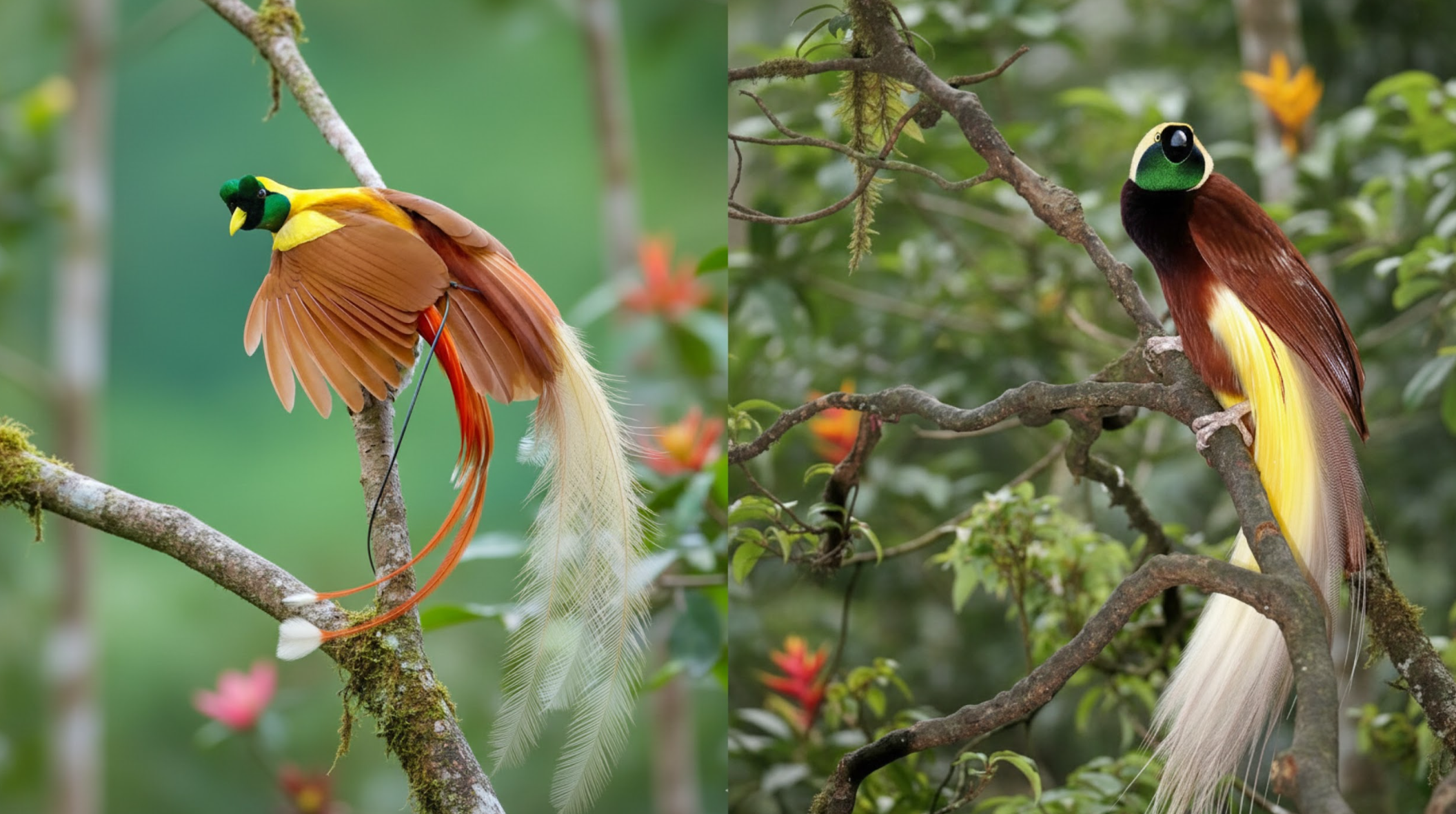 Dijuluki “burung surga” karena memiliki bulu hias berwarna kuning, merah, biru, hijau, hitam metalik dan juntaian seperti pita untuk menarik betina. Para jantan juga punya tarian kawin eksotis dengan melakukan gerakan rumit sambil memamerkan fleksibilitas bulu dan tubuhnya.