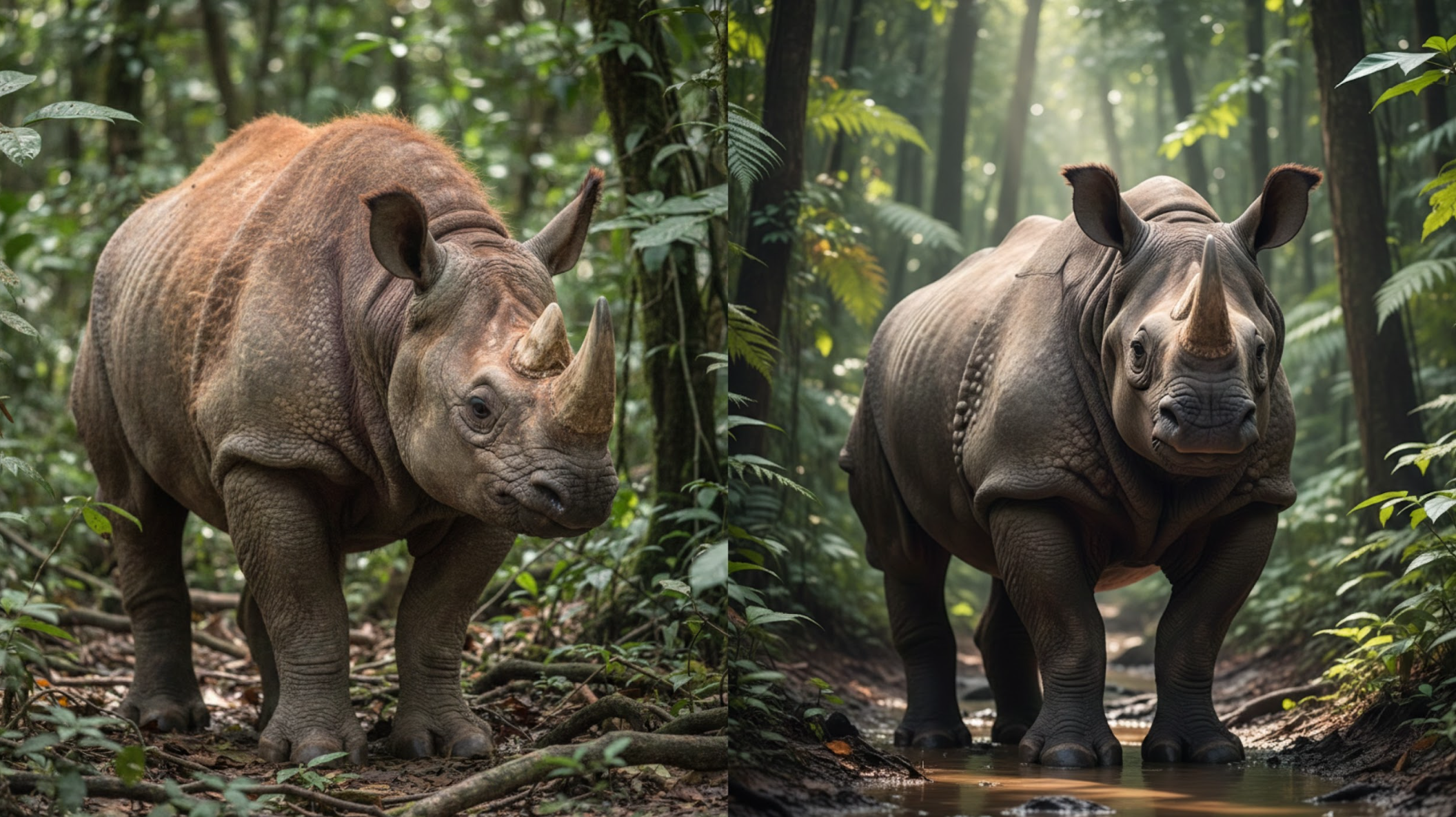 Badak Jawa memiliki satu cula, kulitnya lebih halus dan berwarna abu-abu, ukuran tubuh sedikit lebih besar sekitar 4 meter . Sedangkan Badak Sumatera punya dua cula, tubuhnya coklat kemerahan, ditutupi bulu, dan merupakan badak terkecil di dunia.